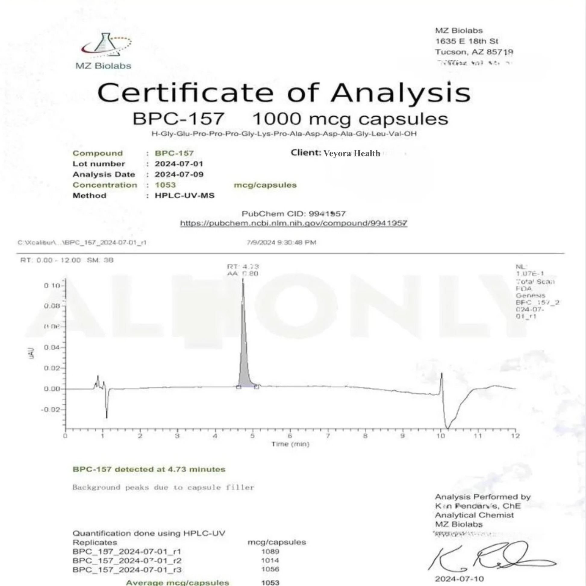 Veyora Health BPC-157 is 99.9% bioavailable when taken with food in the morning, helping manage daytime inflammation and discomfort.